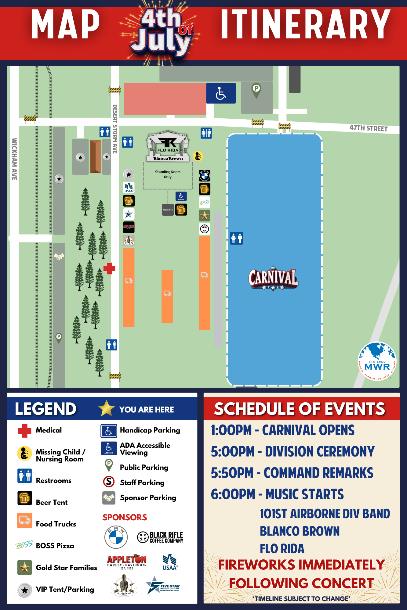 π All attendees should use Gate 1, Gate 4, or Gate 7 to enter the installation for the Fourth of July Fest Concert, fireworks, and carnival.