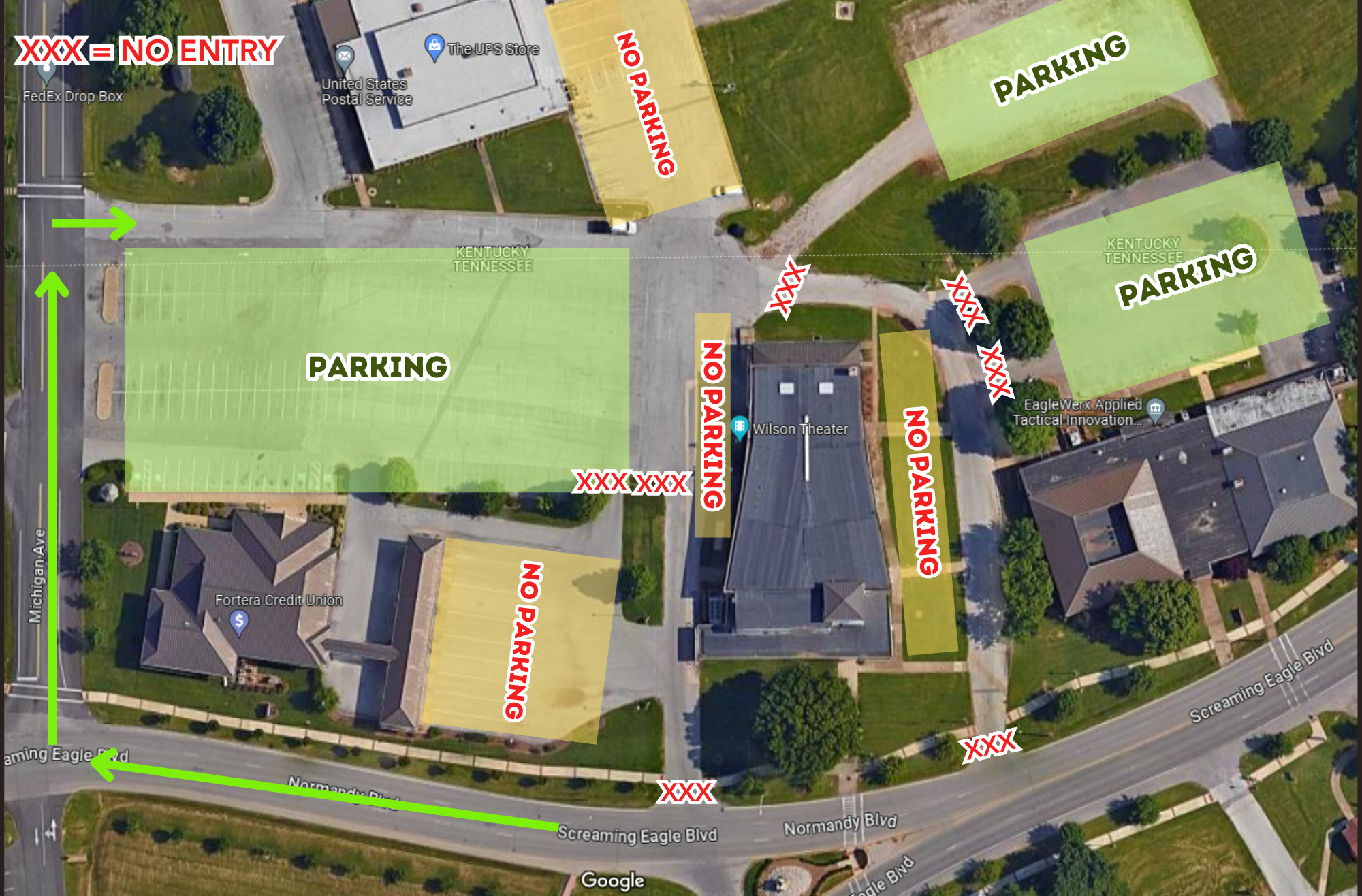 Parking will be provided around Wilson Theater. Please take a moment to review the parking map, parking in a "No Parking" area can result in your vehicles being towed, please only park in the designated parking areas indicated on the map.