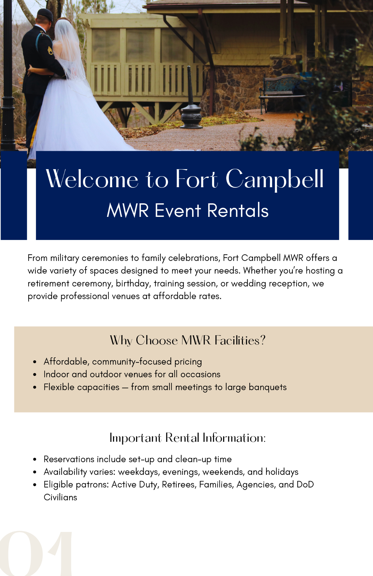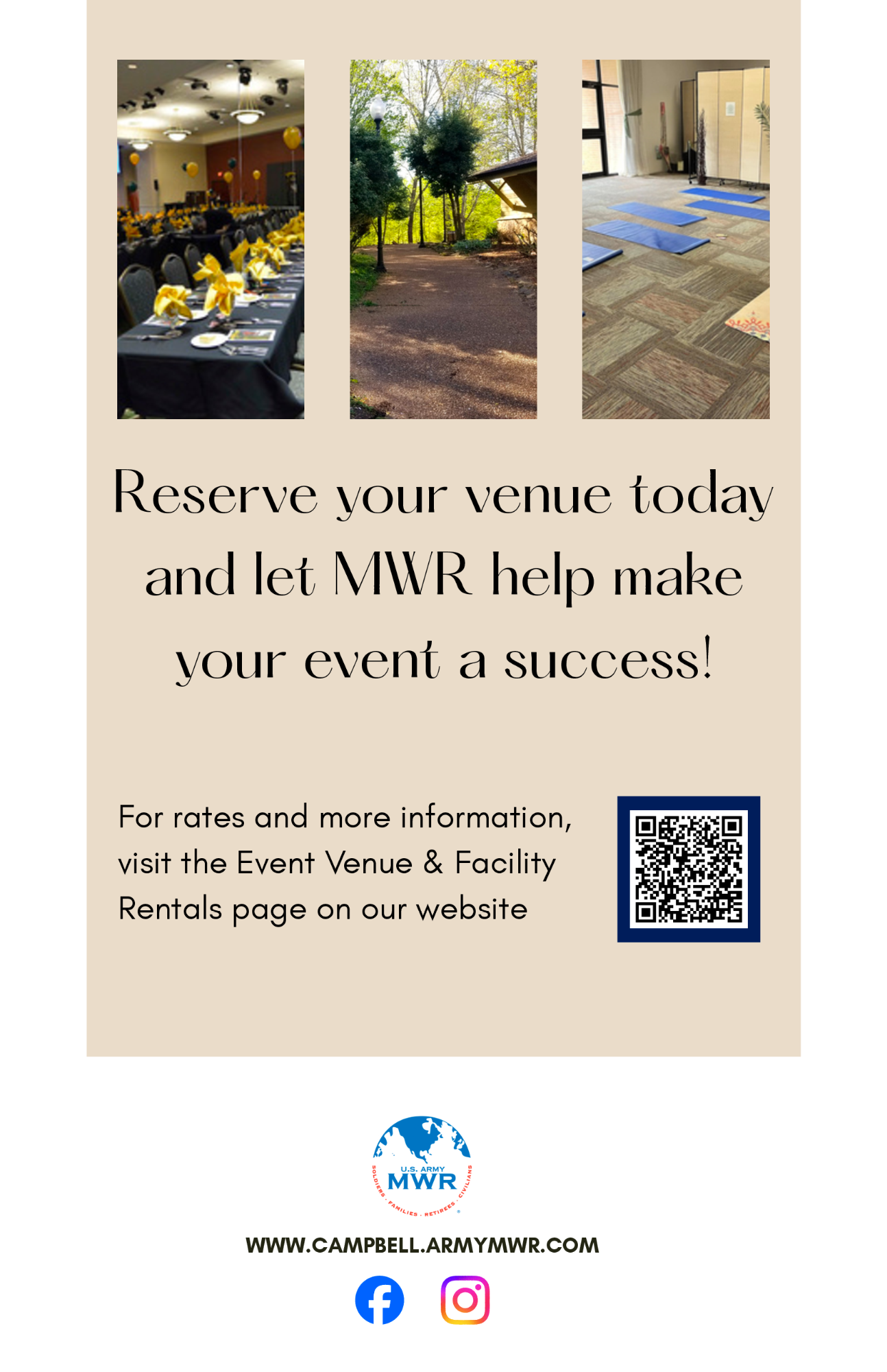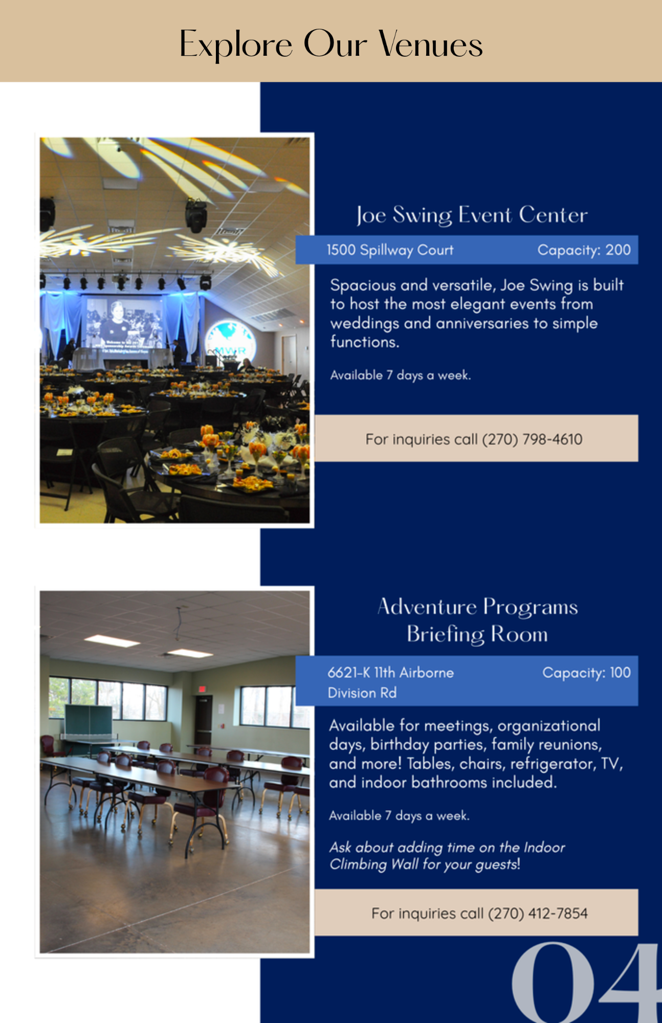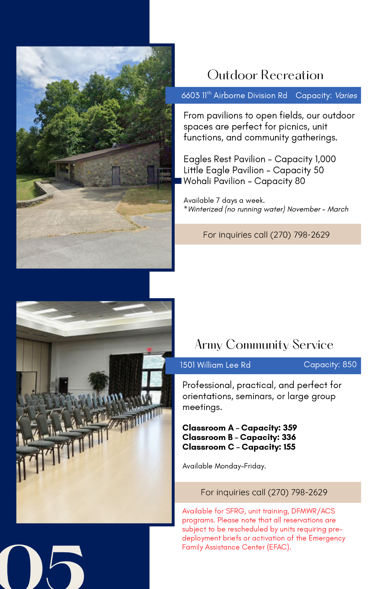 Functions in these facilities must be used for SFRG, unit training, DFMWR/ACS programs. Please note that all reservations are subject to be rescheduled by units requiring pre-deployment briefs or activation of the Emergency Family Assistance Center (EFAC).