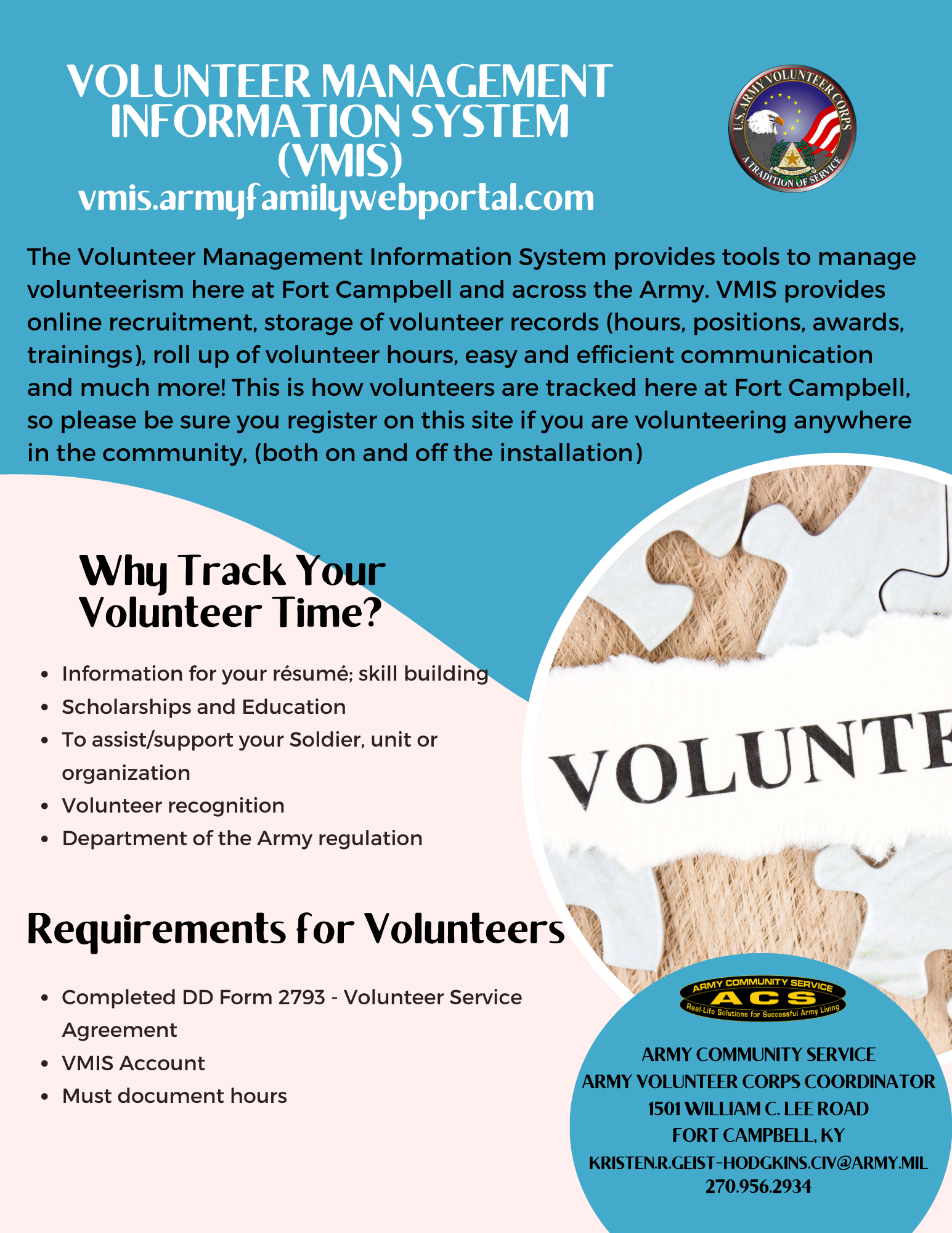 Join us in making a difference by volunteering in the Fort Campbell community! Use the VMIS Quick Start Guide to search for volunteer opportunities on Army OneSource.
