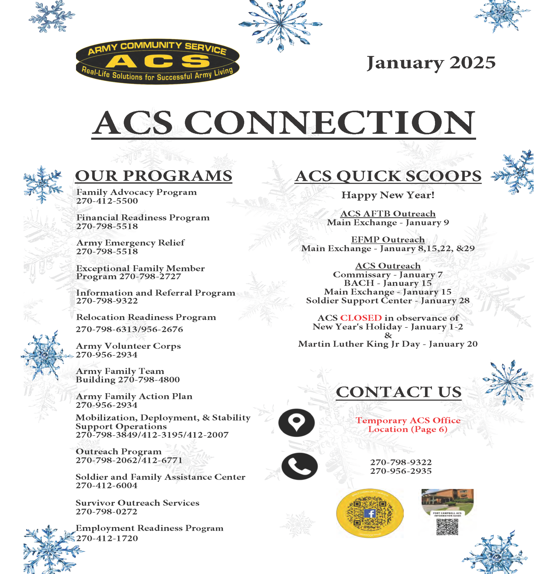 ACS Outreach conducts an annual needs assessment to determine what programs are needed to support Soldiers and Families. Be on the lookout, your input is important to ACS and appreciated.